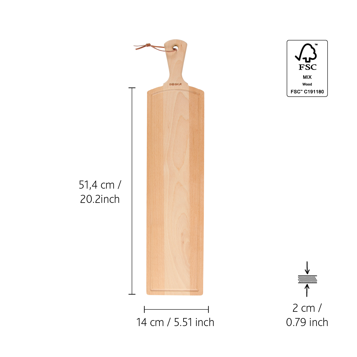 Met de Serveerplank Amigo L serveer je jouw favoriete hapjes op stijlvolle wijze. Deze langwerpige borrelplank is gemaakt van duurzaam geolied beukenhout, waardoor hij een warme en rustieke uitstraling krijgt. Dankzij het stevige handvat en het leren koord hang je de plank eenvoudig op, waardoor hij ook als decoratie een plek in je keuken verdient.